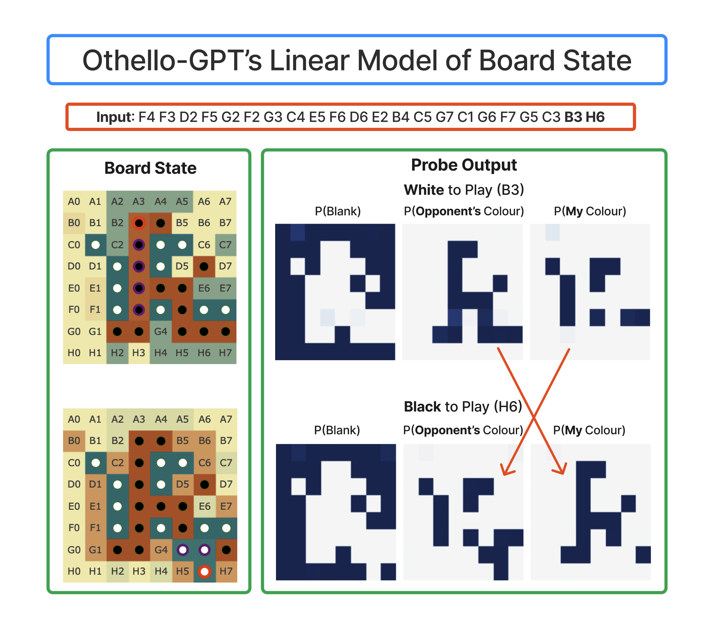 Fig. A3 Interpretability studies on Othello-GPT found that it had an internal representation of the board state even though it had only ever seen letters and numbers.