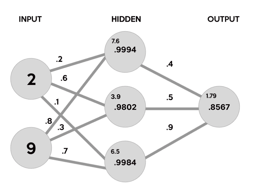 The neural net’s job is to take some numbers as input and then specify what numbers it thinks it will see next, assigning probabilities between 0% and 100% to every number it might possibly see.