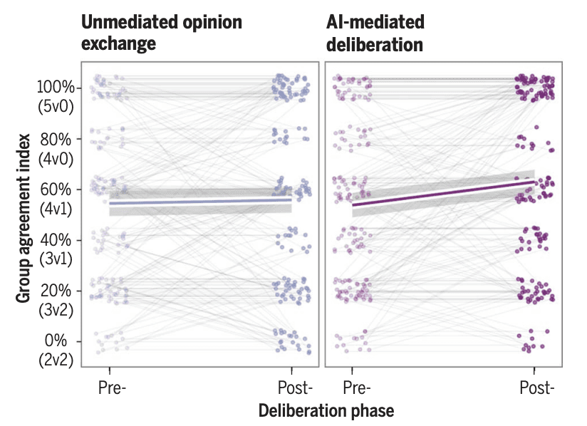 Fig. 27 Level of agreement when people exchange opinions before and after working with an AI mediator to find common ground.