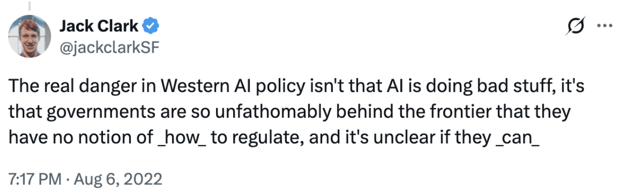 The United States has been woefully incapable of staying in front of technology since the 1995 congressional decommissioning of the Office of Technology Assessment, a Congressional office that produced over 750 studies on issues from health science to space technology and was at the heart of government’s understanding of technology. In the age of AI this is amplified more than ever, with Anthropic co-founder Jack Clark writing ominously in 2022, “The real danger in Western AI policy isn't that AI is doing bad stuff, it's that governments are so unfathomably behind the frontier that they have no notion of how to regulate, and it's unclear if they even can.”