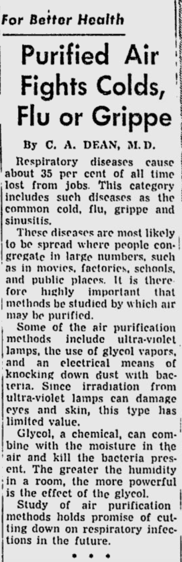 The chlorine and filtration equivalents for air quality have been known since at least 1953, when C.A. Dean published a short opinion in a Salt Lake City newspaper sponsored by the Latter Day Saints. “Some of the air purification methods include ultra-violet lamps, the use of glycol vapors, and an electrical means of knocking down dust with bacteria… study of air purification methods holds promise of cutting down on respiratory infections in the future.”14