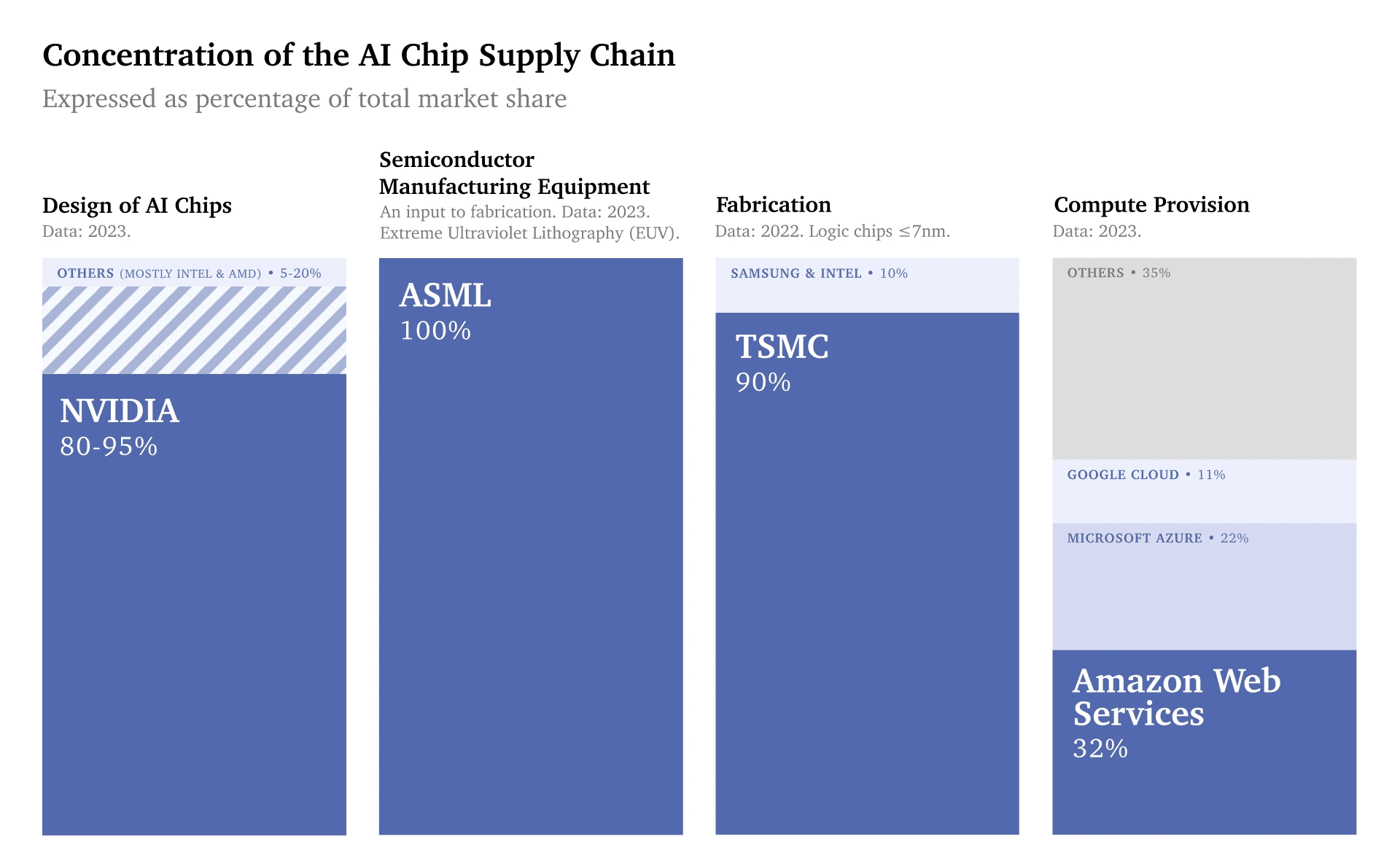 Fig. 26 Percent of total market share of each part of the AI chip supply chain by Nvidia, ASML, TSMC, and AWS.
